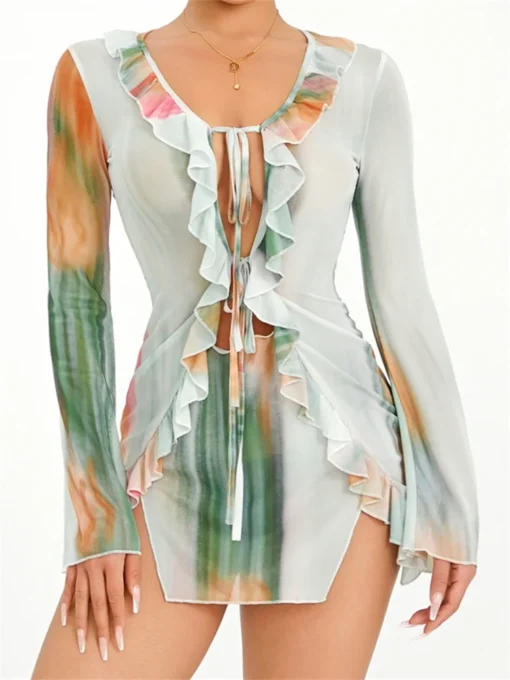 Women Lace Mini Dress Flared Long Sleeve V Neck Irregular Ruffle A-line Mini Dress Summer Fall Sexy Elegant Sundress